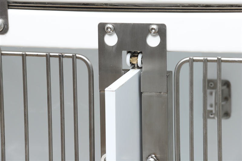 আগে থেকে ইনস্টল করা স্প্রে অগ্রভাগ এবং পায়ের পাতার মোজাবিশেষ, ফিল্টার সহ একটি নিষ্কাশন ব্যবস্থা এবং পাওয়ার সকেট এটিকে নিছক খাঁচা থেকে একটি বহুমুখী ওয়ার্কস্টেশনে রূপান্তরিত করে। বৈদ্যুতিক সরঞ্জাম যেমন অ্যানেস্থেশিয়া মেশিন, অক্সিজেন কনসেনট্রেটর এবং হিটিং প্যাডগুলি সকেটে প্লাগ করা যেতে পারে এবং দরজার কেন্দ্রীয় ক্রসবার থেকে ঝুলিয়ে রাখা যেতে পারে। ভেটেরিনারি ওয়াটারপ্রুফ ফাইবারগ্লাস মডুলার ডগ কেজের সামনের দরজাটি U-আকৃতির বাঁকের মাধ্যমে সানশেড স্থাপনের অনুমতি দেয়, বায়ু বাধা হিসাবে পরিবেশন করার সময় সূর্যালোককে অবরুদ্ধ করে।